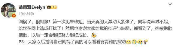 其实,这只不过是个开胃菜而已。照理说,俩人一坐下就应该开始了,可不知道怎么的,翁青雅连个开场白都没,说话就直接问问题了。她说话总是磕磕绊绊的,就在说到一半快说不下去时,工作人员可能让她往前坐了点儿,于是这姐终于挪了挪位置,还用手理了理头发。朱珠这会儿也不知道自己该干嘛,只能傻笑着。